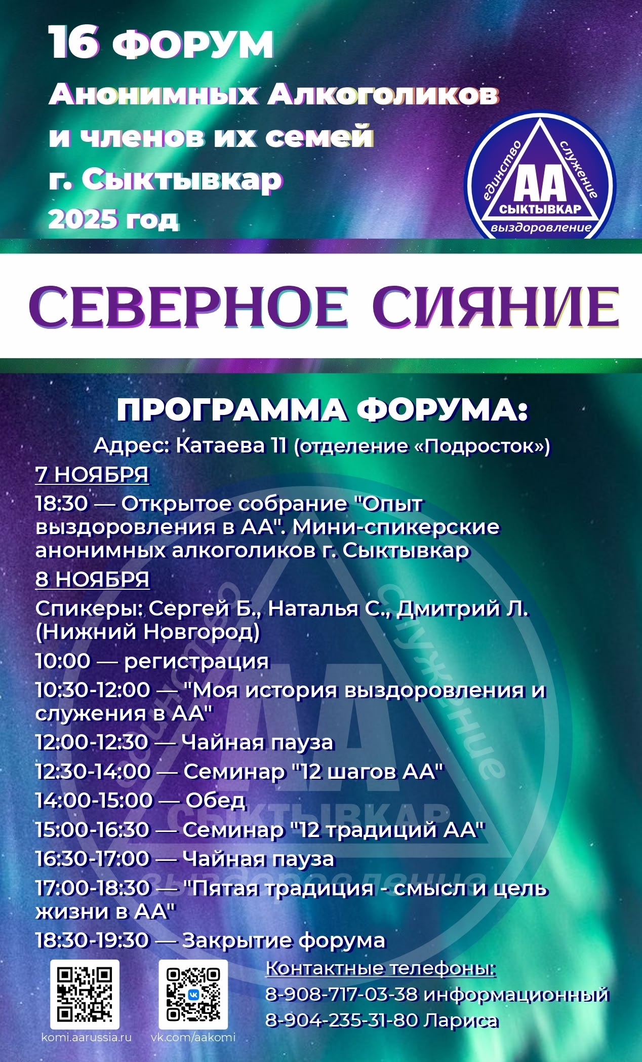 7-8 ноября в Сыктывкаре состоится форум АА и членов их семей. Добро пожаловать всем выздоравливающим, их близким и неравнодушным